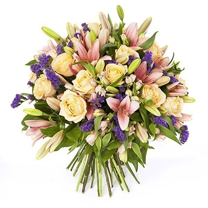 A stunning bouquet with lilies and light peach roses with a special purple touch. Bouquet comes elegantly wrapped and includes premium greenery such as eucalyptus and premium fillers.