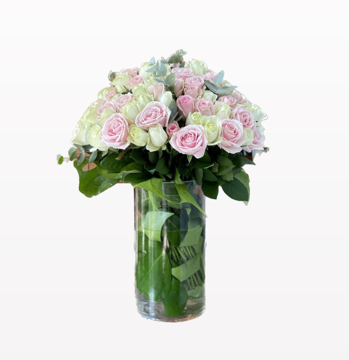 Premium Sweet Pink And White Roses In A Glass Vase