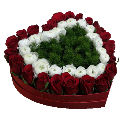 A heart-shaped arrangement with red roses,white eustoma and greenery. Indicate during checkout if you would like it in a black heart-shaped box