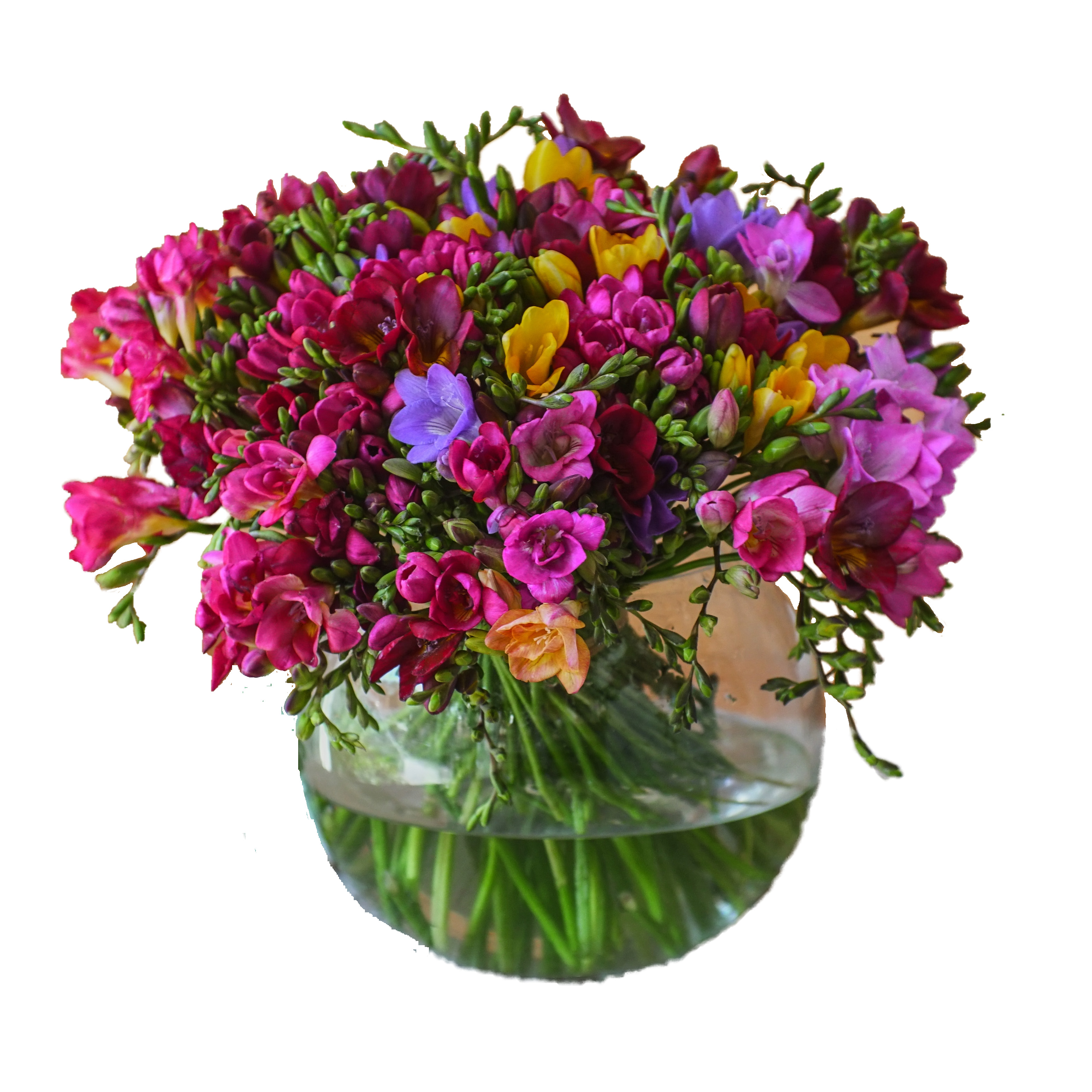 Ten bunches of colorful freesia in a glass sphere vase