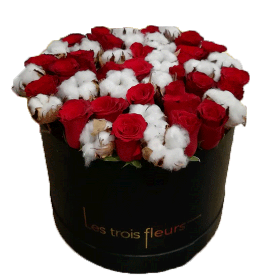 Red roses with cotton stems in a classy large round-box