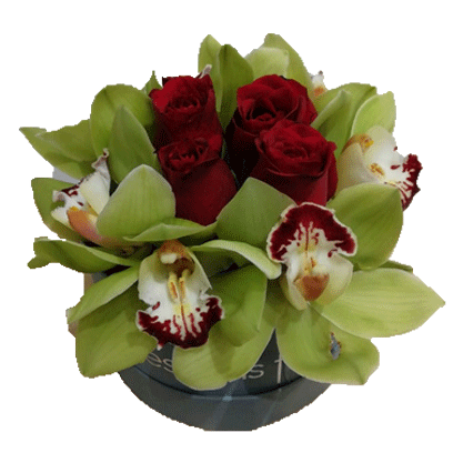 Premium red rose with orchids in a round box